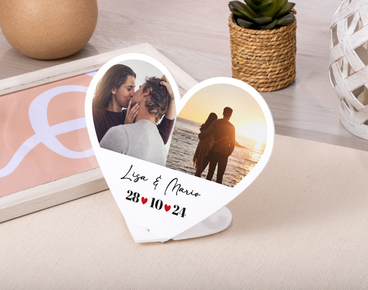 • Corazón de metacrilato personalizado. • Peana de corazón. • Tarjeta Recordatoria.