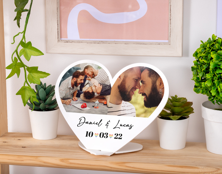 ¿Se acerca una fecha importante para ti y tu pareja? Si quieres sorprenderle este año en el día de vuestro aniversario o en su primer viaje juntos, nuestro corazón personalizado flotante con diseño "Fecha de amor" es justo lo que necesitas. Además, ¡también es un regalo original para San Valentín! Este adorno original quedará precioso en cualquier rincón de la casa. Les recordará esa fecha y el retrato de ese momento tan especial para ti y tu pareja. Está fabricado en metacrilato blanco y consta de dos piezas en forma de corazón: una más grande, donde se imprimirá el diseño, y otra más pequeña que servirá de base para el corazón central. Al recibirlo, solo tendrás que colocar la base en el corazón y ¡listo! ¡Quedará genial! Personalizar este corazón es muy sencillo. Solo tienes que añadir el producto al carrito y entrar al área de personalización. Allí podrás agregar las fotos elegidas, escribir el texto y esa fecha tan especial. Pronto lo tendremos listo y ¡será un regalo único para parejas! Tamaño corazón: 20 x 17,5 cm. Tamaño peana corazón: 10 x 8,8 cm.