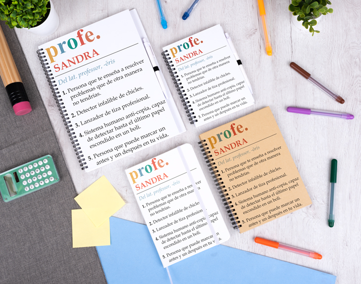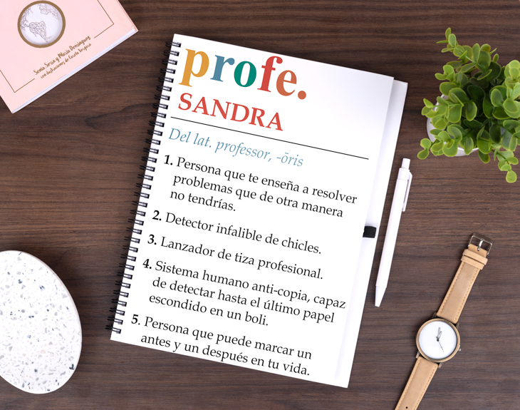 ¿Estás buscando un regalo perfecto para sorprender al profe de tus hijos? Si quieres tener un detalle emocionante a la par que útil, sobre todo para un maestro, este cuaderno personalizado será la clave para tocarle el corazoncito tras un curso escolar de lo más movido. ¡Podrás escoger el estilo de cuaderno que quieres! Este cuaderno con diseño para profes será la mejor forma de explicarle todo lo que ha sido para sus alumnos a lo largo del año. ¡Es un diseño que le describirá a la perfección! Podrás elegir el cuaderno que quieras entre las opciones que encontrarás en el desplegable: grande, pequeño, bloc y cuaderno ecológico. ¡Escoge la más apropiada para ese gran profesor! Lo único que le falta a este regalo original para profesores es saber el nombre del maestro más especial. ¡Seguro que le define a la perfección! Escoge el tipo de cuaderno que quieres entre los cuatro disponibles y añádelo al carrito, desde donde podrás acceder al área de personalización. ¡Escribe el nombre del mejor profesor o profesora!
