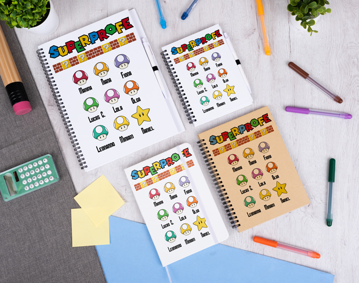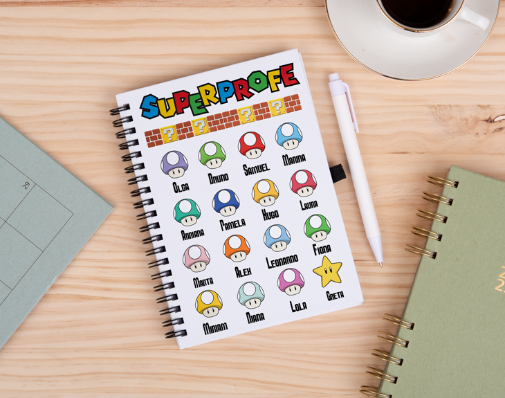 Las clases llegan a su fin y se acerca la época de las despedidas con los compañeros y con el maestro. Si este año os da mucha pena despediros de vuestro profesor favorito, está claro que tenéis que hacerle el mejor regalo de todos para que nunca se olvide de sus alumnos favoritos. Nuestro cuaderno personalizado con diseño "Superprofe Mario Bros" es un detalle precioso. Este cuaderno es genial para usarlo como agenda o para esos profes que necesitan apuntarlo todo en un papel para que no se les olvide nada. ¡Es genial! Y lo mejor es que es personalizable. ¡Podrás escribir el nombre del mejor profe del mundo! Tiene un diseño inspirado en Mario Bros súper chulo, también podéis escribir el nombre de toda la clase, le encantará. Personalizar este cuaderno es muy sencillo. El primer paso a seguir consiste en añadir el producto al carrito y entrar al área de personalización. Una vez ahí, ya puedes escribir el nombre que tú quieras. Pronto estará perfecto y listo para regalar. ¡Será un original regalo para profes!