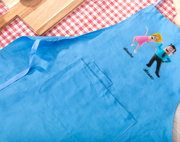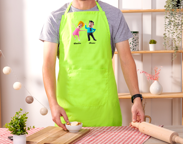 • Delantal de cocina personalizada (60 cm x 69 cm) 100% algodón. • Tarjeta recordatoria.