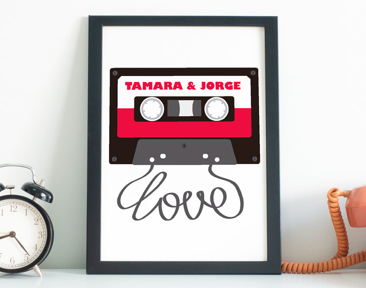 ¿A tu media naranja y a ti os mola el rollo vintage? Puede que os encanten los vinilos, vestir con ropa que llevaban vuestros padres, o comprar muebles en tiendas de antiguedades. Si ese es vuestro rollo, supongo que también querréis celebrar San Valentín de la manera más retro. Para esa clase de personas tenemos este diploma personalizado, que le dará sonido a vuestro tremendo amor. Si os gusta la cultura pop, la música y el estilo vintage, creo que tienes el regalo perfecto para este 14 de febrero. ¿Creéis que vuestro amor es como un vinilo, que por mucho que pasen los años nunca pasa de moda? Entonces este particular diseño, en el que podemos ver un cassette formando la palabra Love, es un detalle esencial. Para que tu lámina sea aún más especial, podrás personalizarla incluyendo vuestros nombres en la parte de arriba de este cassette tan especial. ¡Declárate con este regalo original tan retro! Importante: El color del marco puede variar según stock. Tamaño de la lámina: A4.