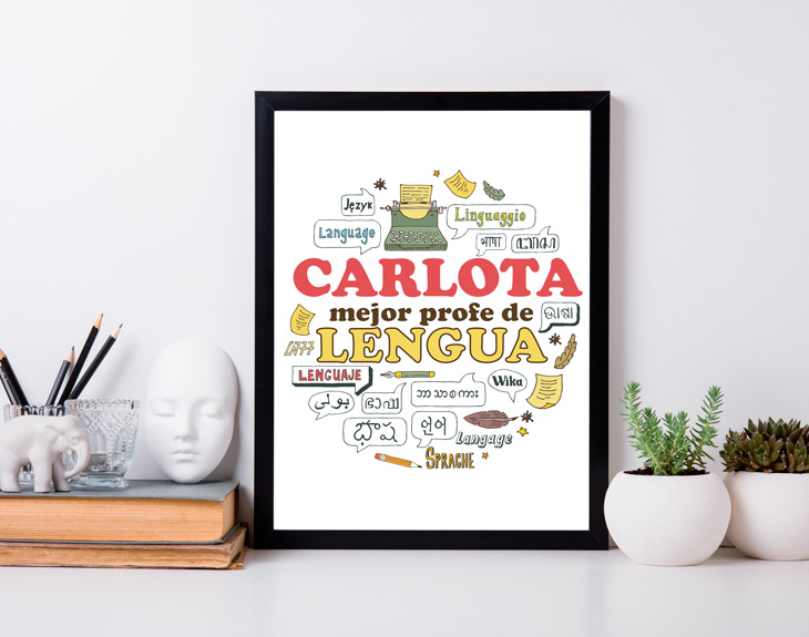 Si la gramática y la literatura nunca os han parecido tan fácil, seguro que es gracias a vuestro o vuestra profe de Lengua, que mejor forma de agradecérselo que con esta lámina personalizada. Es una forma original de sorprender a vuestro profe por el final de curso. Seguro que le hace mucha ilusión que sus alumnos le hagan un detalle tan especial como este. Además es una forma bonita de valorar todo el esfuerzo y trabajo de vuestro profe, porque sin los profes de lengua no sabríamos ni leer ni escribir. Solo nos tendrás que decir el nombre de vuestro o vuestra profe y nosotros lo añadiremos a este diseño tan chulo. Este diseño está lleno de detalles en referencia a la lengua y la literatura. Estamos convencidos de que le encantará. Tienes dos tamaños de lámina para elegir. Importante: El color del marco puede variar según stock.