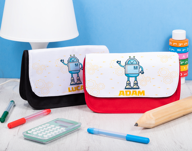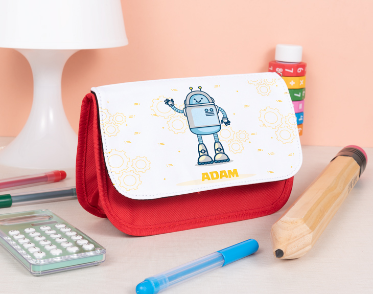 El estuche personalizado perfecto para el pequeño robot de la casa empiece las clases de la forma más divertida y emocionante posible. Imagínate la carita que se le quedará cuando aparezcas el día antes de comenzar el curso con este estuche...¡Le encantará! Además, es genial para que guarde todos sus rotus y no pierda ni uno. Solamente tienes que decirnos su nombre para personalizarlo y elegir el color que más le guste. Un regalo original y muy útil para empezar el nuevo curso con las pilas cargadas. ¡No pienses más! Medidas: 20 cm x 12,5 cm x 6 cm