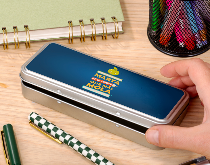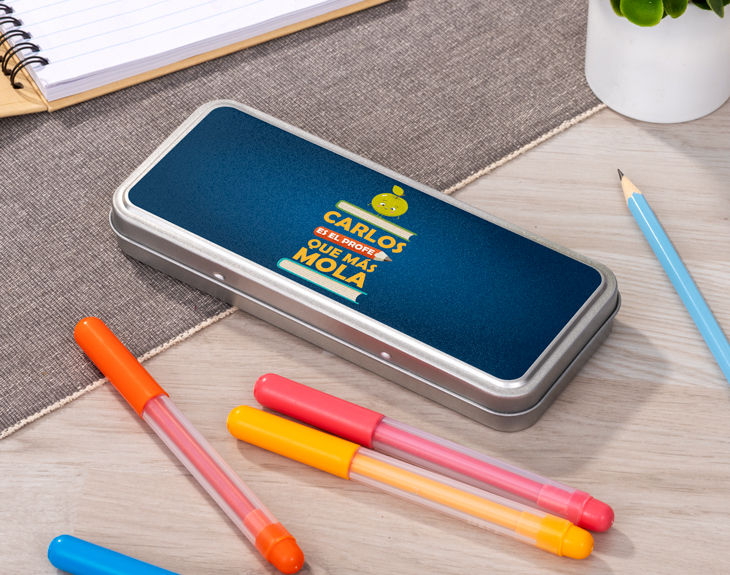 ¿Se acerca el final de las clases y queréis darle una sorpresa a vuestro o vuestra profe? Entonces, este estuche metálico personalizado es el regalo perfecto para sorprender a vuestro profe. Esta es una forma muy bonita de darle las gracias a vuestro profe por to o lo que os ha enseñado. Además, vuestro profe podrá guardar todos los lápices y bolis en este estuche tan chulo y siempre se acordará de vosotros. ¿No os parece una idea genial? Para personalizarlo, solo nos tenéis que decir el nombre de vuestro o vuestra profe y nosotros haremos que el diseño de este estuche quede súper tierno. Estamos seguros de que le hará muchísima ilusión y siempre llevará este estuche consigo. Material: aluminio. Medidas: 2,5 cm x 7,5 cm x 18,5 cm.