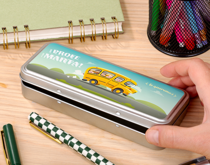 Este estuche metálico personalizado es una original y divertida forma de decirle a vuestro o vuestra profe que es la mejor del mundo y que la queréis mucho. Aprovechad el final del curso para darle las gracias por todo lo que habéis aprendido en sus clases y por lo mucho que os ha ayudado. Seguro que a vuestra profe le hace mucha ilusión que sus alumnos le hagan un regalo tan especial como este. Estamos convencidos de que a partir de ahora este estuche irá con ella a todas partes. Personalizar este estuche es muy sencillo, solo nos tenéis que decir el nombre de vuestro o vuestra profe y nosotros nos encargaremos de que el diseño quede perfecto. ¡Le encantará! Material: aluminio. Medidas: 2,5 cm x 7,5 cm x 18,5 cm.