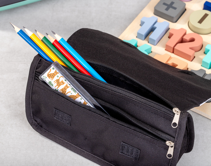 • Estuche escolar personalizado. • Regla transparente personalizada. • Cinco lápices negros. • Tarjeta Recordatoria.