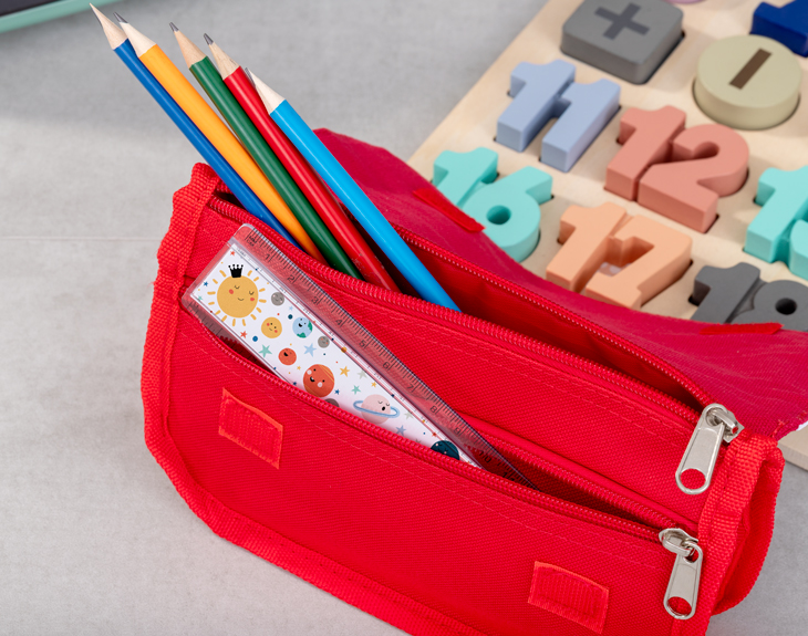 • Estuche escolar personalizado. • Regla transparente personalizada. • Cinco lápices negros. • Tarjeta Recordatoria.