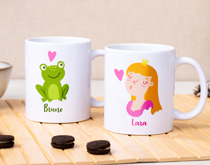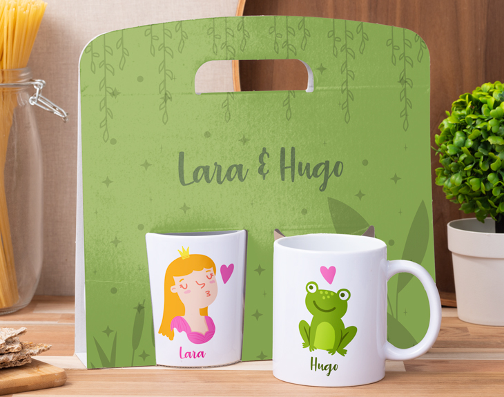 ¿Te imaginas besar a un sapo y que se convierta en tu príncipe azul? Si el amor ha aparecido en tu vida cuando menos te lo esperabas, estas tazas para parejas son perfectas para agradecer a esa personita todo lo que hace por ti. Además, si vuestra historia parece sacada de un cuento y te sientes más feliz que nunca, es el momento de demostrarle todo tu amor...¡Ahora solo queda que llenes de besos a tu príncipe favorito! Solo tienes que decirnos vuestros nombres para la personalización y se morirá de emoción e ilusión al ver este estuche tan divertido. Medidas: 26,5 cm x 25,5 cm.