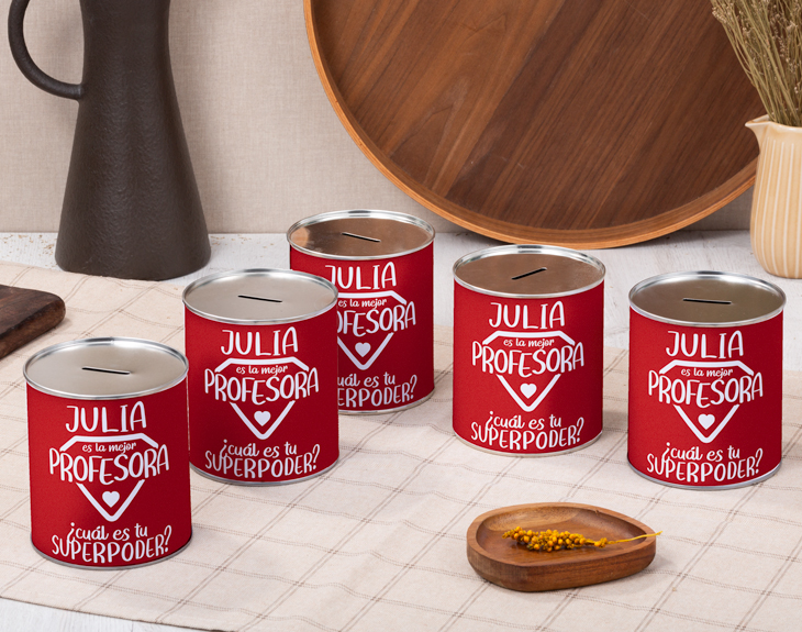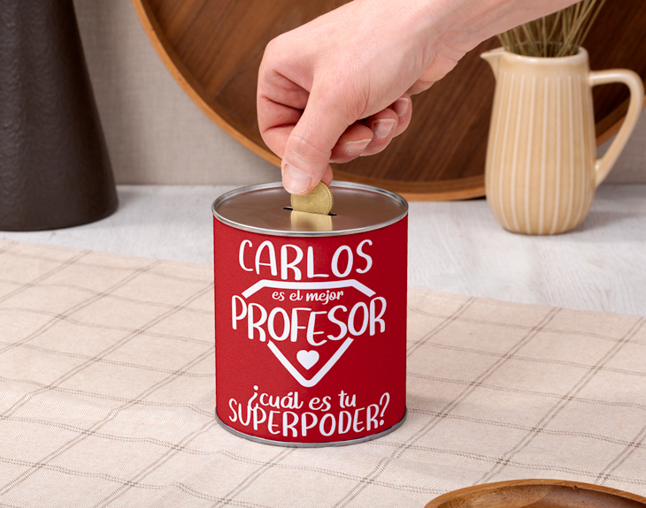 El mejor profesor se merece cualquier capricho que desee: una cena exquisita, un viaje, un coche... Con todo lo que os ha cuidado y enseñado, ¿qué puedes hacer para agradecérselo? Aunque no puedas comprarle todas esas cosas, sí puedes ayudarle a conseguirlas con esta hucha de lata personalizada con nombres. Tendrá el espacio suficiente para guardar todas las monedas y billetes que necesite para conseguir sus sueños. Este diseño rojo con un corazón está disponible en versión profesor y profesora. Selecciona el que prefieras y añade su nombre. ¡Mira en la previsualización lo bonito que quedará junto a su escudo como de superhéroe! Con todo el cariño y la originalidad del mundo, tendrás con tan solo un clic un gran regalo original para profesores. Si tienes más de un super-profesor, puedes llevarte una segunda hucha redonda de metal a un precio reducido. ¡Personaliza cada una con un nombre distinto! Medidas: -32 cm de circunferencia -10 cm de diámetro -11,5 cm de altura Material: metal Importante: esta hucha no está preparada para abrirse frecuentemente. Una vez abierta no se puede volver a cerrar.