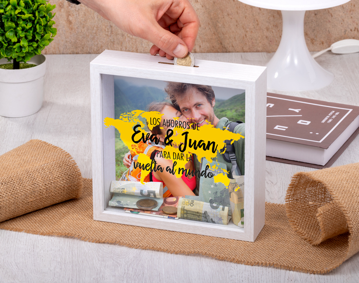 ¿Quién es esa persona con la que te irías hasta el fin del mundo? Seguro que aún tenéis muchísimos lugares a lo largo y ancho de la Tierra por recorrer. Da igual lo que tardéis, ¡algún día los visitaréis todos! Y como queremos ayudaros a conseguirlo, hemos creado justo para vosotros esta hucha de madera personalizada y con foto. Hemos puesto el mapa del mundo justo en el cristal frontal para que siempre tengáis la mira puesta en todos los lugares a los que algún día podréis ir. ¡Tan solo toca ahorrar diariamente! Este es un regalo original para esos amigos, familiares o pareja que les encantan las aventuras y viajar al extranjero. Pero también, sería un estupendo detalle con esa persona con la que quieres hacer tantos viajes. Por ello, puedes llevarte dos huchas con el mismo o diferente diseño por un precio menor que si las compraras por separado. ¡Y puedes personalizar cada una con el texto e imagen que quieras! Además de poder crearla a tu gusto, esta hucha blanca cuadrada no desentonará con la decoración de tu hogar como muchas otras huchas. Por ello, será tanto un buen lugar donde guardar el dinero como un bonito elemento de decoración de tu casa. Simplemente dinos una vez añadas el producto los nombres a grabar sobre el cristal y la imagen que irá en el cartón de fondo, y ya habréis dado el primer paso de ese viaje que, con el dinero que guardaréis aquí dentro, algún día ocurrirá. Para abrir la hucha de madera podrás hacerlo en la parte trasera, donde encontrarás el cartón que cierra la hucha. Ahí tendrás que abrir las cuatro pestañas negras que encontrarás a cada uno de los lados de la hucha. Ahora podrás retirar el cartón y obtener todos tus ahorros. ¡Será el momento de hacer ese viaje que tanto has soñado!