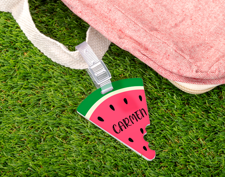 ¡Es el momento de volver a viajar! Estamos segurísimos de que ya tienes planeadas todas tus vacaciones. Después de muchísimos meses de estrés, tareas que cumplir y trabajos que realizar, ha llegado lo que todos estábamos esperando: un periodo de relajación total. ¿A dónde tienes planeado viajar? Puede que prefieras quedarte por tu país, recorriendo lugares míticos y ciudades famosísimas que estaban pendientes de visitar. ¿Eres aún más aventurero? ¡Es posible que tengas un viaje mucho más ambicioso! Da igual si vas a visitar las ciudades más famosas del mundo o las selvas y bosques más inexplorados: tienes que tenerlo todo organizado. ¿Y qué puede haber peor en unas vacaciones que que se te pierda la maleta? Es un chasco tremendo, pero para eso nosotros tenemos la solución: con el identificador de maletas personalizada "Sandía" no tendrás ningún problema. Esta chulísima etiqueta para maletas no solo dejará bien claro quién es el dueño de dicha maleta. Además, decorará tu equipaje como ningún otro identificador. ¡Este regalo original es súper divertido! Si tienes un amigo viajero, podrás sorprenderle con este producto. Le servirá para todos sus viajes. Lo único que tienes que hacer es escribir su nombre y sus datos, y nosotros nos encargaremos de crear el mejor identificador de maletas posible. ¡Todo un regalazo! Medidas: 8x7 cm.