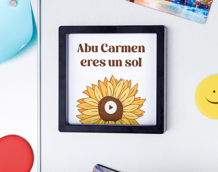 Si pensamos en las personas que iluminan nuestras vidas, las madres y abuelas son, sin duda, algunas de las más radiantes. Con su alegría, incondicionalidad y cariño, nos llenan de amor siempre. Y para ellas, que son verdaderos soles en nuestro mundo, tenemos el regalo perfecto. Si ya estás cansado/a de los típicos detalles, nuestro imán reproductor personalizable es justo lo que necesitas para sorprenderlas. Este imán no es solo un simple adorno para la nevera, ¡es un reproductor de música! Sí, no solo podrás personalizarlo con el nombre que quieras, sino que también podrás insertar el audio que más te guste. Tu canción favorita o incluso un mensaje de voz. Lo que desees que el imán reproduzca cada vez que presiones el botón de play. ¡Un detalle que quedará increíble! Este imán musical es, sin lugar a dudas, un regalo original para cumpleaños, el Día de la Madre o cualquier ocasión especial en la que quieras hacerle saber a esa persona importante que es un verdadero sol en tu vida. El último paso para hacer este regalo aún más único es personalizar el imán con audio. Es muy fácil: entra en nuestro diseñador, escribe el texto que quieras y, luego, podrás añadir el audio que prefieras. Desde un mensaje de voz hasta un archivo MP3 con esa canción que tanto te emociona. ¡Será un regalazo único! Medidas: 10,9 x 10,9 cm. Cómo reproducir el audio: para poder reproducir el audio, solo tienes que presionar el lugar exacto que te indicamos en la imagen del producto. Importante: Estos imanes reproductores son recargables. Su batería, situada en la parte trasera, te permite conectar un cable USB de tipo C.