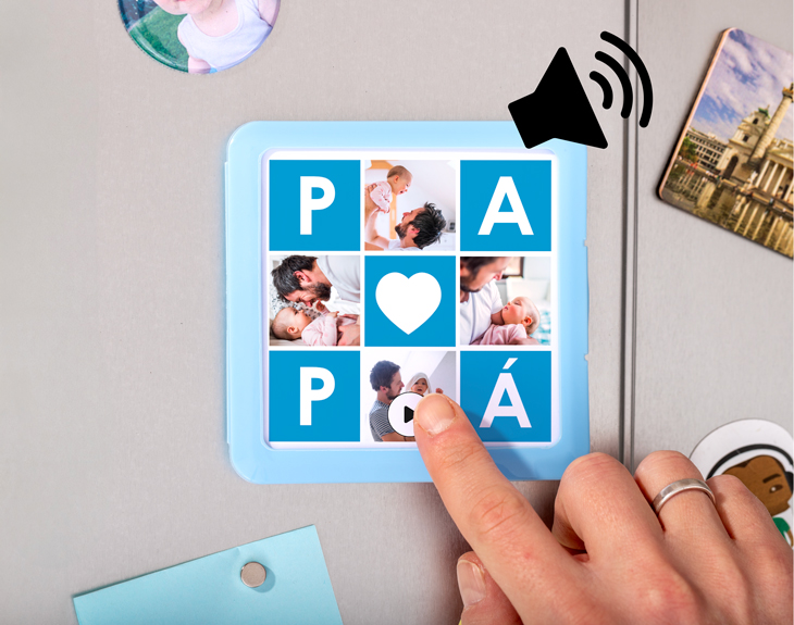 Se acerca el Día del Padre y puede que no sepas qué regalarle este año. No te preocupes porque tenemos la solución para que triunfes con el mejor regalo del mundo y es este imán musical personalizado que le dejará sin palabras. Porque cualquier padre querría tener en la nevera un imán con sus fotos favoritas y con una sorpresa que se esconde si le da al 'play'. Sin duda, este original imán es el regalo que necesitas para el cumple de papá o el Día del Padre porque lo tiene todo. En primer lugar, vas a poder elegir el color que más te guste para la caja (rojo, amarillo, rosa, blanco o azul). Después, no sería lo mismo si no pusieras tus fotos favoritas con papá en este precioso mosaico, porque quedarán genial. Y por último y lo más guay de todo, es que este imán cuenta con un reproductor en el que podrás grabar desde un mnesaje de voz o añadir vuestra canción favorita. ¡La podrá escuchar siempre que quiera! Para poder personalizar este imán, solo tienes que añadir el producto al carrito y seguir los pasos que te indicamos. Elegir el color, añadir el audio y cargar en el sistema las fotos que quieras que aparezcan en este diseño. Así de fácil. Nosotros nos encargamos de que quede perfecto y listo para regalar. ¡Será el mejor regalo del mundo! Medidas del imán: 11 x 11 cm. Colores disponibles: rojo, rosa, amarillo, blanco y azul. Importante: Estos imanes musicales son recargables. Su batería, situada en la parte trasera, te permite conectar un cable USB de tipo C.