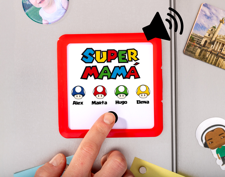 Seguro que siempre has pensado que mamá no es una persona cualquiera... ¡Es una supermamá! Y es que tiene el poder de escucharnos, educarnos, entendernos y siempre estar a nuestro lado y eso se merece sorprenderla con un regalo único y muy divertido: ¡su propio imán musical personalizado! Y como la cosa va de superhéroes, su diseño no podía ser menos porque está inspirado en Mario Bros y todo su universo. ¡Le encantará! Aprovecha que se acerca el Día de la Madre para regalarle a mamá este original imán de colores que quedará genial en vuestra nevera. Porque además de tener un diseño súper guay, gracias a su reproductor mamá podrá escuchar el audio que tú hayas querido dejarle: vuestra canción favorita, un mensaje que nunca quieres que olvide... ¡Y podrá reproducirlo siempre que quiera! Pero antes de recibir este regalazo, tienes que personalizarlo. ¿Y cómo puedes hacer eso? Muy fácil. Añade el producto al carrito y entra en el área de personalización. El siguiente paso es elegir el color del imán y cuántos personajes quieres. Después, podrás poner todos los nombres y listo. ¡Será el mejor regalo del mundo! Medidas del imán: 11 x 11 cm. Colores disponibles: rojo, rosa, amarillo, blanco y azul. Importante: Estos imanes musicales son recargables. Su batería, situada en la parte trasera, te permite conectar un cable USB de tipo C.