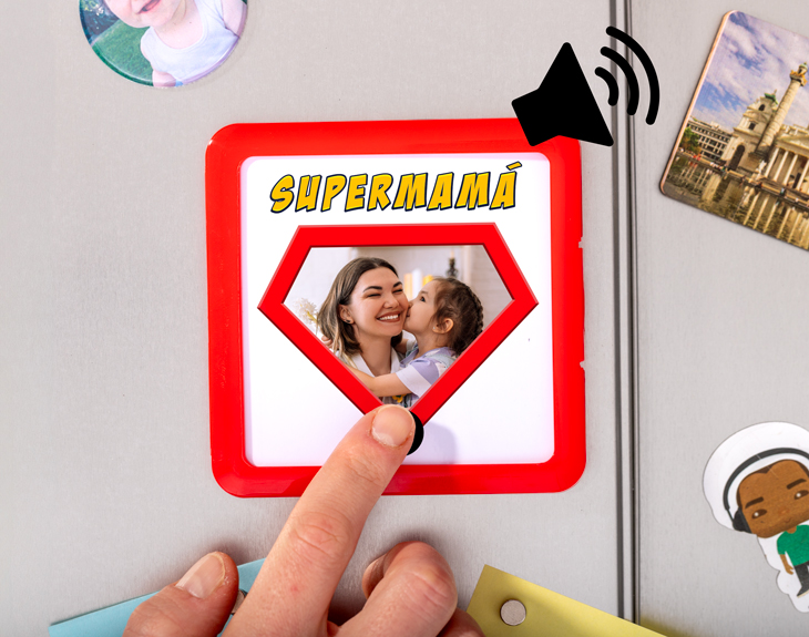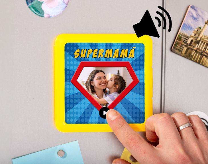 Si quieres reconocer a tu madre por los superpoderes que demuestra cada día en su rol, necesitas un regalo realmente especial y diferente. Imagina un detalle que lo tenga todo: emoción, originalidad, diversión y, por si fuera poco, ¡música! Eso y mucho más lo encontrarás en nuestro imán musical personalizado. Con un diseño de "Supermamá", podrás personalizarlo con vuestra foto favorita y convertirlo en un recuerdo inolvidable. Pero lo mejor de este original imán no es solo su aspecto: también puedes elegir el color del marco entre los disponibles y añadir un mensaje de voz o una canción especial. Gracias a su mecanismo de reproducción, tu madre solo tendrá que pulsar “play” para emocionarse con lo que escuche. Un detalle único que, sin duda, le encantará. Personalizar este regalo original es muy fácil: entra en el área de personalización, sube el audio, elige el color del marco y añade vuestra mejor foto. Ajusta el diseño a tu gusto y… ¡listo para sorprender! Este Día de la Madre, dile cuánto la admiras con un regalo que lo dice (y lo canta) todo. Medidas del imán: 11 x 11 cm. Colores disponibles: rojo, rosa, amarillo, blanco y azul. Importante: Estos imanes musicales son recargables. Su batería, situada en la parte trasera, te permite conectar un cable USB de tipo C.