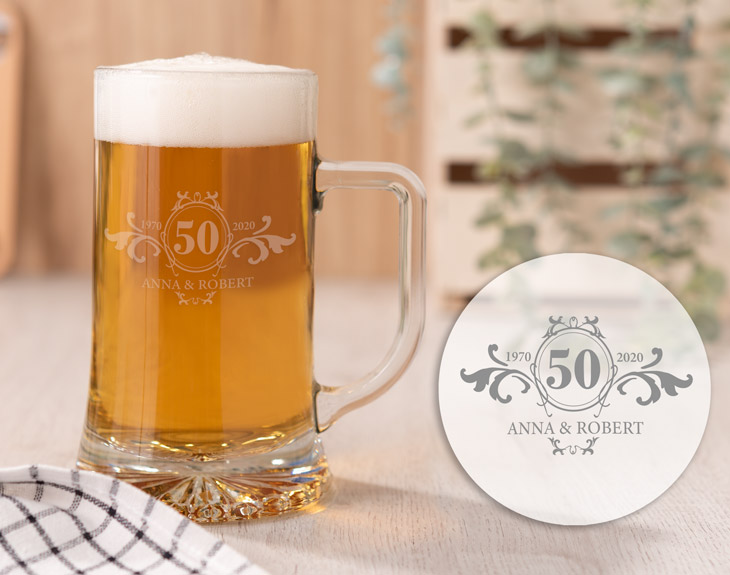 Hace cincuenta años que os dijisteis ‘Si, quiero’ y prometisteis cuidaros, amaros y respetaros para siempre; y por ahora no vais mal encaminados. Celebrar cincuenta años de matrimonio no lo hacen todas las parejas y por eso hay que celebrarlo por todo lo alto. Para la celebración hemos diseñado esta jarra de cerveza personalizada en la cual podemos grabar vuestros nombres, el año en que sucedió ese día tan especial y el año actual. ¡Un amor tan grande y real hay que celebrarlo en condiciones! Diámetro interior: 7cm Medidas aproximadas: 8,5 x 15,5 cm