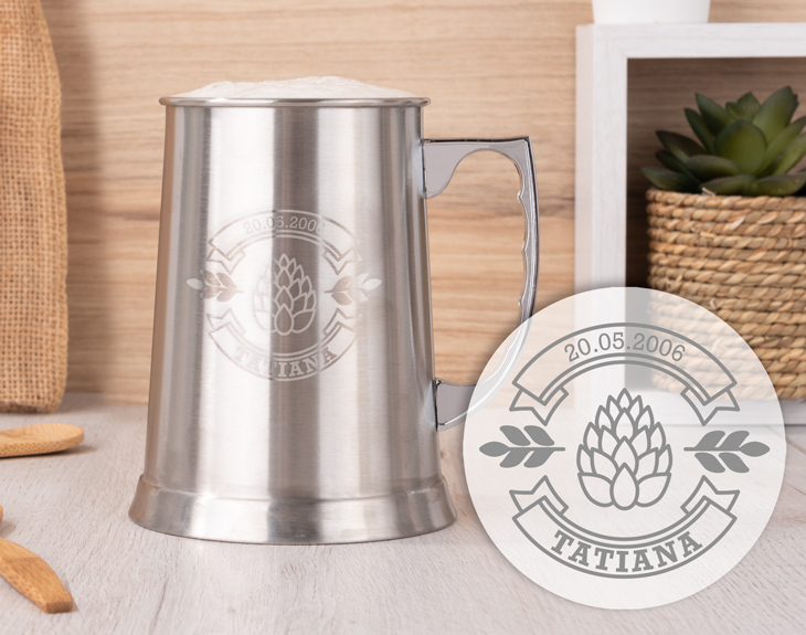 • Jarra de cerveza grabada. • Tarjeta recordatoria.