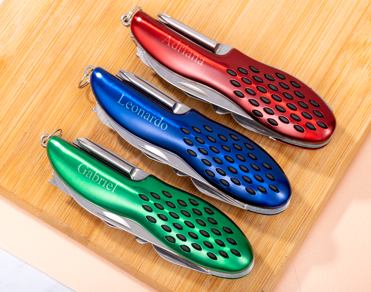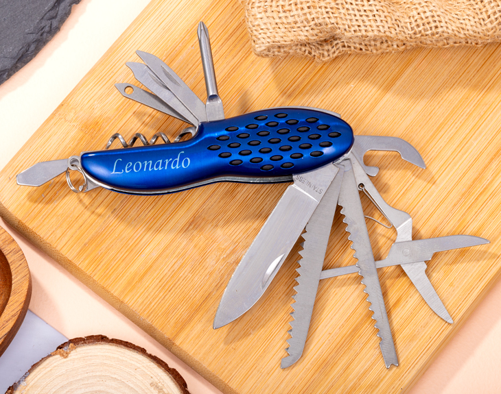 • Navaja multiusos grabada. • Bolsa de tela personalizada. • Llavero de madera grabado. • Tarjeta Recordatoria.