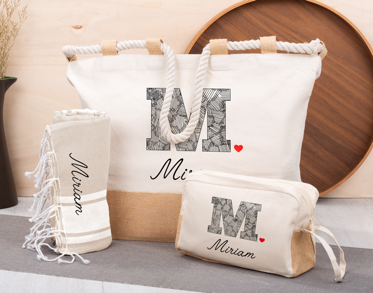 • Bolso Sailor personalizado. • Neceser Ibiza personalizado. • Toalla flecos personalizada. • Tarjeta recordatoria.