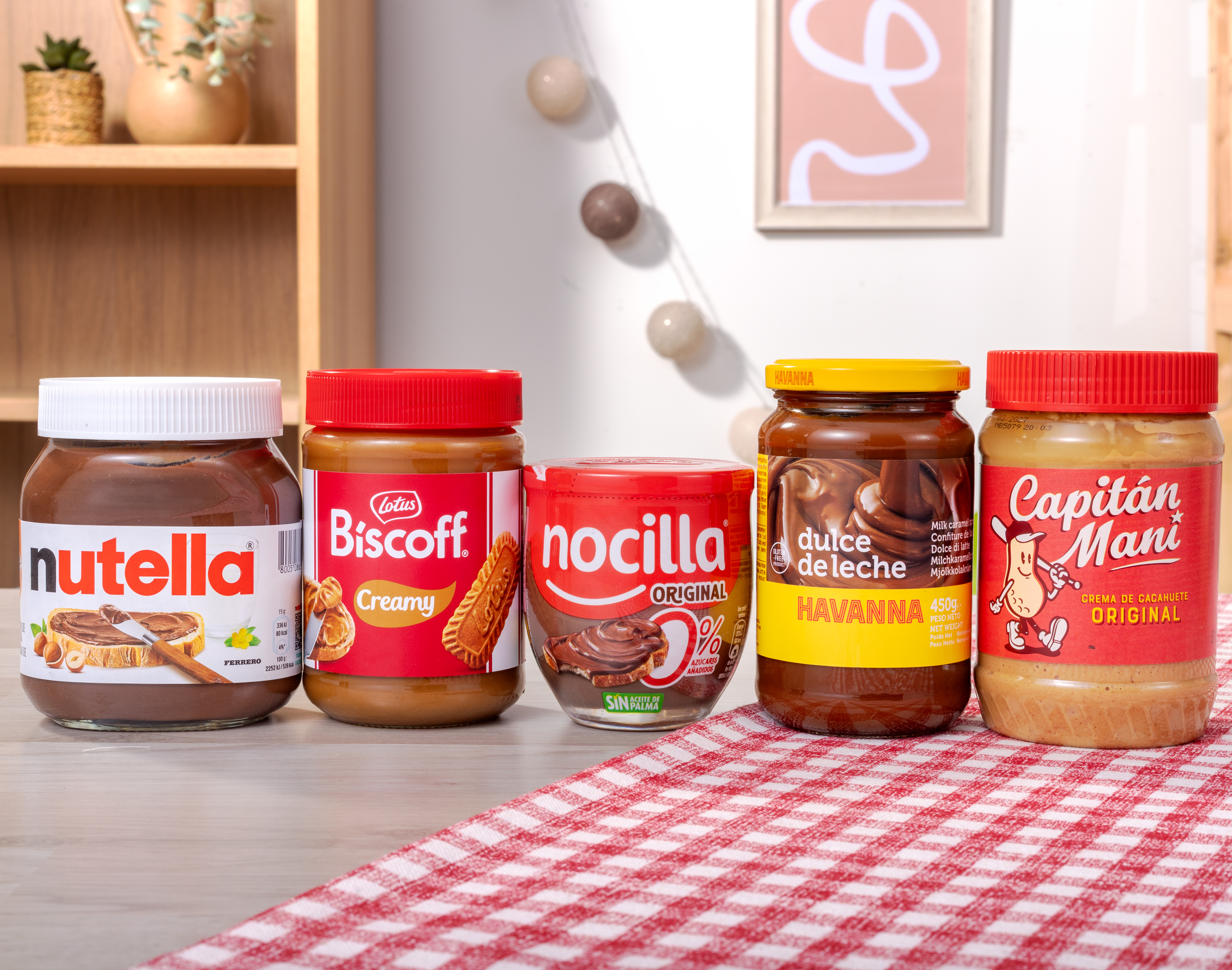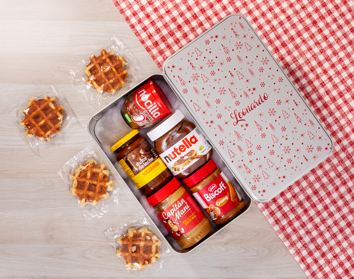• Caja personalizada. • 4 gofres. • Bote de Nutella. • Bote de Nocilla. • Bote de Dulce de Leche. • Bote Capitán Maní. • Bote de crema Bíscoff. • Tarjeta Recordatoria.