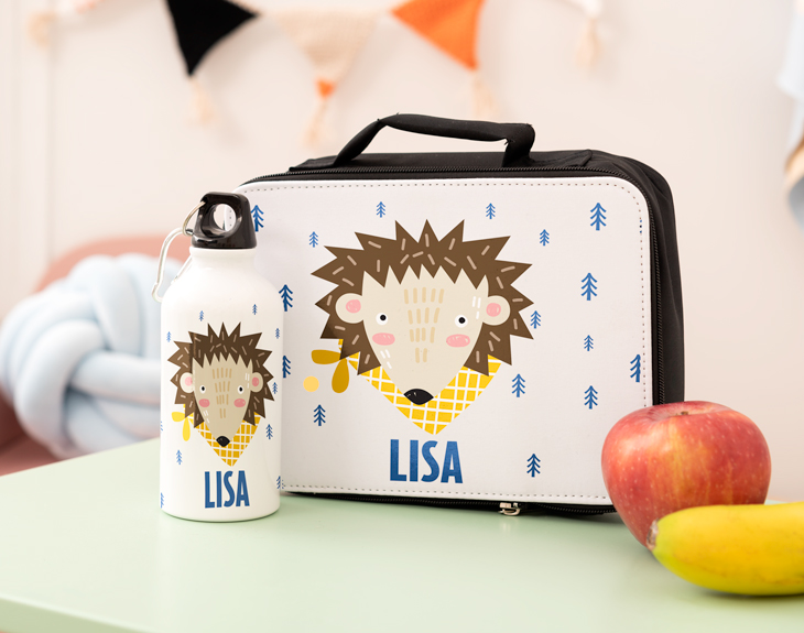 • Cantimplora de aluminio (500ml) • Lunchera pequeña personalizada (24 x 8 x 7 cm). • Tarjeta Recordatoria.