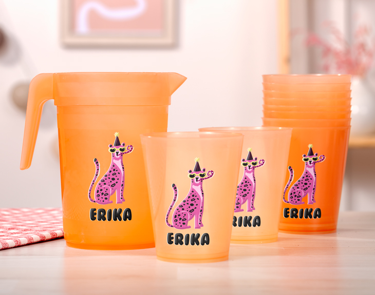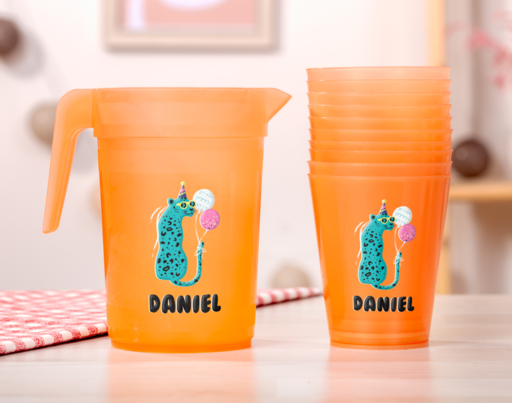 • Jarra naranja de plástico personalizada. • 10 vasos naranja de plástico personalizados. • Tarjeta Recordatoria.
