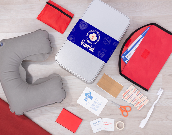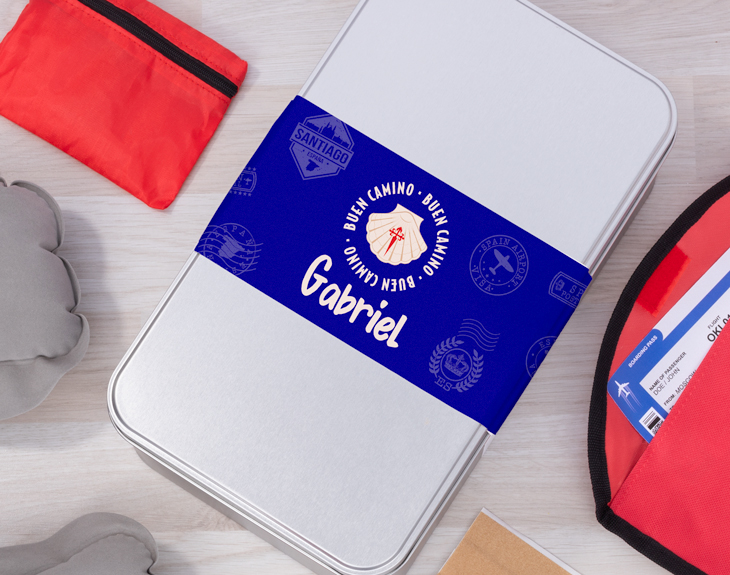 Si has llegado a ese punto de tu vida en el que te apetece hacer el Camino de Santiago, te recomendamos que te hagas con este kit para viajeros personalizado porque te va a salvar la vida en muchas ocasiones durante esta aventura. Aunque si no eres tú el que se anima, siempre puedes regalárselo a alguien. ¡Le encantará! Este original kit contiene todo lo necesaria para superar todas las etapas del Camino de Santiago. Vas a poder encontrar desde una powerbank, un botiquín y hasta una almohada hinchable... Porque nunca sabes cuándo la puedes necesitar. ¡Será el regalo perfecto! Y lo mejor de este detallito tan especial es que podrás personalizar la caja donde va todo guardado. Entra en nuestro diseñador y escribe el nombre que quieras en la etiqueta que irá alrededor de la caja metálica. ¡Es hora de empezar esta aventura!