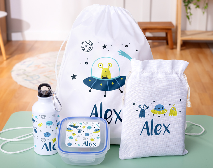 • Cantimplora aluminio personalizada. • Túpper personalizado. • Bolsita de tela personalizada. • Mochila de cuerdas personalizada. • Tarjeta Recordatoria.