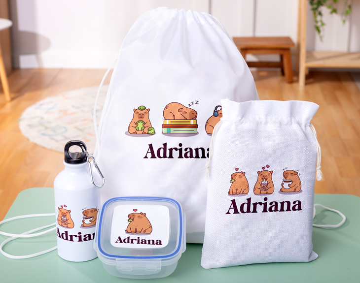 ¿Se acerca la vuelta al cole y aún no tienes nada preparado para tu peque? ¿Y encima le encantan las capibaras y sus divertidas ocurrencias? Entonces este kit personalizado para la vuelta al cole es justo lo que necesitas.Viene con diseños súper coloridos y simpáticos de capibaras, esos adorables animalitos que transmiten calma y ternura, ¡y que a los peques les encantan! Este pack personalizado para el cole es perfecto para que volver a clase se convierta en toda una aventura. Incluye: un tupper de plástico, ideal para llevar la merienda, una mochila de cuerdas, perfecta para las actividades extraescolares, una cantimplora para mantenerse bien hidratado durante todo el día y una mini bolsita de tela, ideal para guardar pequeños accesorios. Y si a tu peque le cuesta despedirse del verano, este es sin duda un regalo original que le animará y le hará empezar el curso con muchísima ilusión. Personalizar el kit es muy fácil: solo tienes que añadirlo al carrito y, en el área de personalización, empieza la diversión. Podrás diseñar cada artículo uno por uno, añadiendo el nombre de tu peque. Así estará tranquilo como una capibara, pero listo para volver al cole con todo lo necesario. No olvides personalizar todos los articulos de este pack. - Túpper: Medidas: 12,5 x 12,5 x 6,5 cm. Material: plástico transparente. - Cantimplora: Altura de la botella: 17 cm. Capacidad: 400 ml. Material: Aluminio. - Mochila de cuerdas: Medidas: 34,5 cm x 41 cm. Material: suave poliéster 210T - Bolsita de tela: Medidas: 25 x 17,5 cm.
