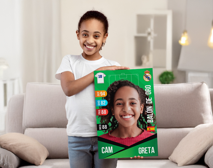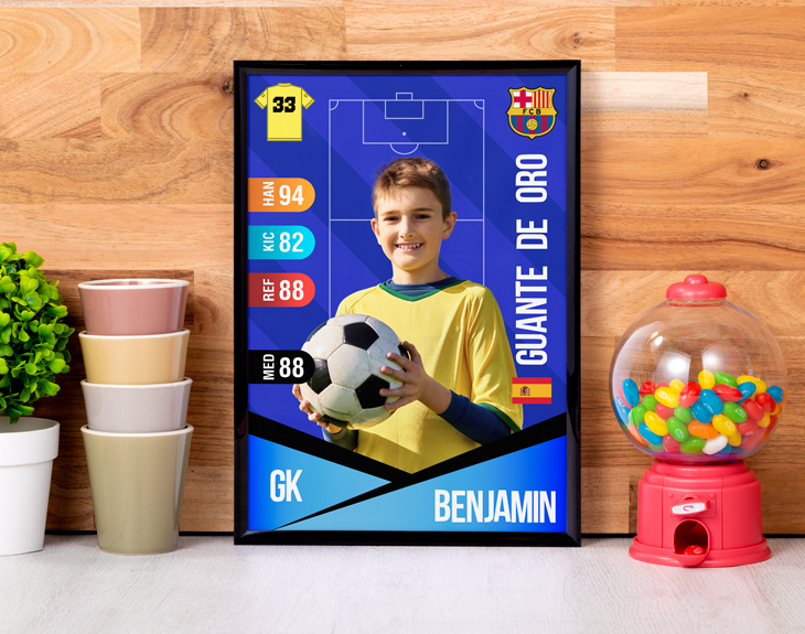 Sabemos lo importante que es que los niños hagan deporte, y no hay nada más emocionante para los padres que verlos disfrutar y triunfar en lo que les apasiona. Si el fútbol es la pasión de tu hijo o hija, seguro que tú eres su primer fan. Por eso, te traemos el regalo más original para los pequeños deportistas. Te presentamos nuestra lámina personalizada con diseño "Cromo fútbol", un regalo único y súper especial con el que podrás sorprenderle y demostrarle todo tu apoyo. Lo mejor es que es completamente personalizable: podrás completar toda la ficha de jugador o jugadora, incluyendo su nombre, equipo, temporada, número de camiseta y mucho más. Personalizar esta lámina es muy sencillo. Solo tienes que añadir el producto al carrito y acceder al área de personalización, donde podrás completar todos los datos y subir las fotos que quieras. En poco tiempo tendrás un regalo perfecto para cualquier pequeño futbolista. Importante: El color del marco puede variar según stock. Importante: Las opciones de lámina gigante y grande no incluyen marco. Solo tiene marco la opción de A4. Podrás elegir esta lámina en el tamaño que quieras: A4, grande (48 x 33 cm) o gigante (85 x 60 cm). Importante: Si escoges la opción "versión digital" te enviaremos el diseño por mail en alta resolución. De esta manera, tendrá la calidad necesaria para que puedas imprimirla en cualquier formato. En el formulario de entrega tendrás que seleccionar la opción "Recibir por Email para ahorrar los gastos de envío".