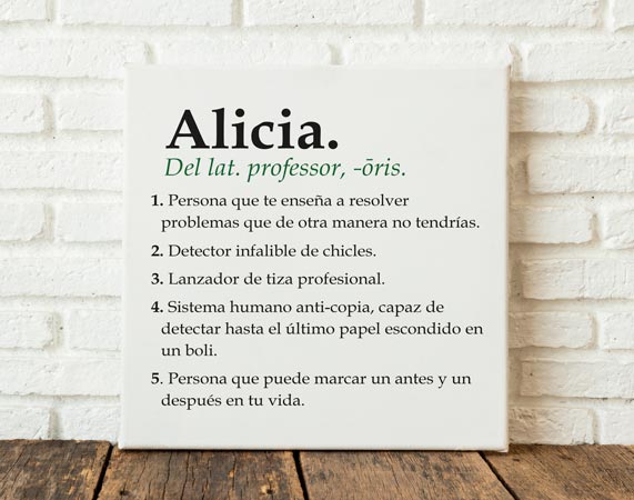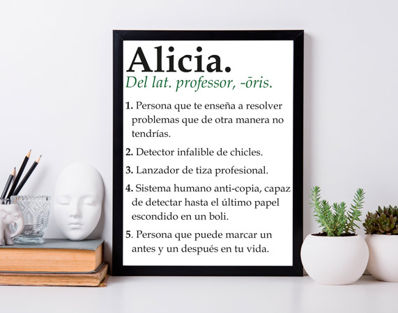 Sorprende a tu profe favorito con esta lámina personalizada tan original. Si es también un detector de chicles infalible, la persona con más precisión del mundo lanzando tizas o el sistema anticopia más avanzado que existe, esta lámina es el regalo perfecto. Podéis ponérselo en su mesa, cuando lo vea le hará muchísima ilusión. Además de reírse un montón seguro que también se emociona. ¡Lo colgará para siempre en su despacho! Podrás elegir esta lámina en dos tamaños: A4 o gigante, este último con unas medidas de 85 x 60 centímetros. Importante: El color del marco puede variar según stock.
