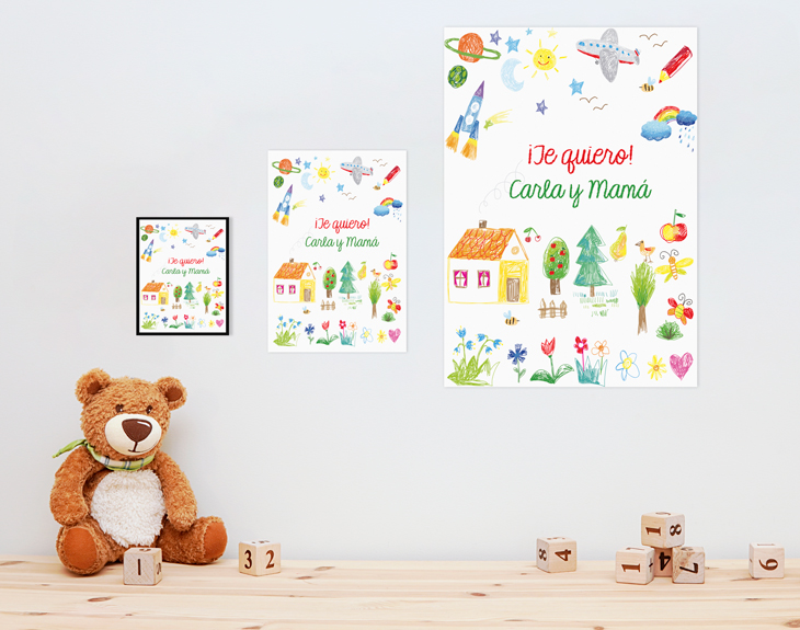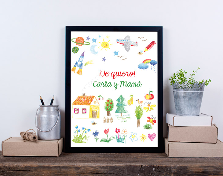 ¿Te acuerdas cuando de pequeña hacías dibujos en el colegio? ¿En esos dibujos siempre aparecía mamá? Seguro que la mayoría de las veces tu madre era la protagonista de la preciosa creación. ¿Te acuerdas de las caras de ternura que ponía tu mamá cuando recibía tus dibujos? Ahora tienes la oportunidad de revivir el momento con esta lámina personalizada. Puedes escribir dos frases, uno encima del otro. En el ejemplo hemos escrito "Te quiero, Carla y mamá", pero puedes escribir tú el texto que quieras. Haz que tu mamá llore de emoción y se muera de amor con este regalazo. Lo colgará en casa y sonreirá cada vez que lo vea. Importante: El color del marco puede variar según stock.