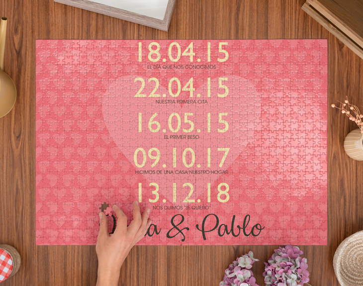 Plasma los mejores momentos de tu relación en esta lámina personalizada, y dale una sorpresa enorme a tu pareja. Si lleváis muchos años juntos y os han pasado cosas maravillosas, será perfecto plasmarlas en esta lámina. Escoge hasta 5 fechas y escribe vuestros nombres. Te quedará una lámina preciosa y lista para colgarla en la pared de vuestro dormitorio o salón. ¡Qué romántico! Tienes dos tamaños de lámina para elegir, una pequeña que incluye un marco negro, y otra más grande para cubrir gran parte de la pared. Importante: El color del marco puede variar según stock. Podrás elegir esta lámina en dos tamaños: A4 o gigante, este último con unas medidas de 85 x 60 centímetros.