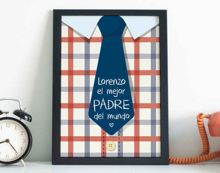 ¿Siempre ves a tu papá vestido de traje? ¿Va elegante con su corbata? Esta es una manera de regalarle una corbata de una manera súper original: en forma de lámina personalizada. Además, podrás personalizar la corbata con el nombre de tu padre. Es un regalo original perfecto para el Día del Padre. ¿Cuántas veces has querido sorprenderle con algún detalle original y nunca has sabido cómo? Esta lámina es perfecta para que la cuelgue en su habitación y le recuerde todos los días que es el mejor papá del mundo. Además, tienes la opción de elegir dos tamaños de lámina: A4 o 60x85 cm. Importante: El color del marco puede variar según stock.