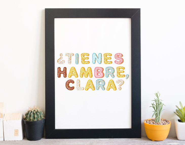 ¿A quién no le apetece comerse un buen dulce de vez en cuando? Sabemos que muchas veces no es lo más sano, pero es casi imposible resistirse a esos sabores tan azucarados y deliciosos. Es complicadísimo no comerse alguna de estas delicias, pero hay que reconocer que unos riquísimos donuts siempre están bien. ¡Nadie puede controlarse con uno de estos gustosos bollos! La dieta es muy dura, y mantener la línea en estos tiempos es aún más difícil. Los donuts siempre apetecen, y más cuando son de distintos sabores: fresa, chocolate, con crema... ¡para todos los gustos! Si te encantaría ver estas delicias todos los días, nosotros tenemos la solución: esta lámina personalizada está hecha para ti. Y es que vestirá cualquier rincón de tu casa de una manera irremplazable. Podrás añadir el mensaje que quieras, tanto para ti como para sorprender a esa persona golosa que tienes en tu vida. Contamos con dos tamaños de lámina: el clásico tamaño folio A4 o el gigante de 60x85 cm con un marco negro incluido. ¡Mándale un mensaje súper dulce con este regalo original!