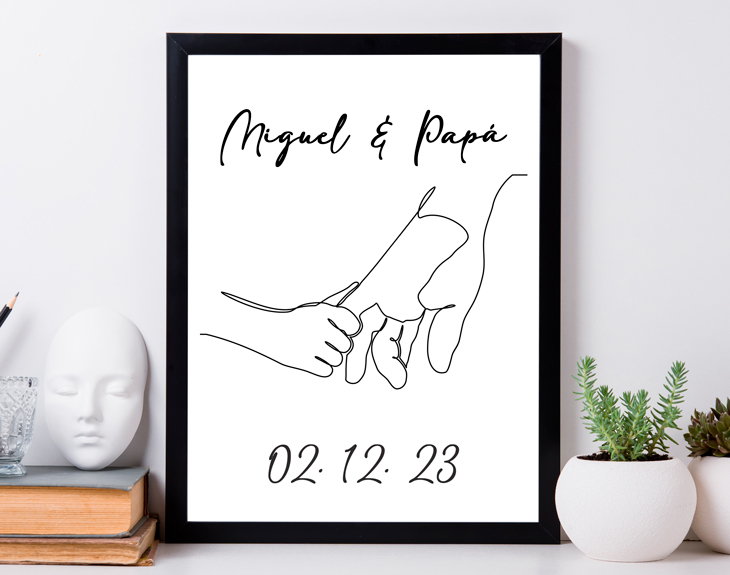Ser padre es, sin lugar a dudas, una de las experiencias más bonitas que hay. Por eso, si quieres sorprender a ese amigo que acaba de tener un hijo, tenemos el regalo perfecto. Se trata de nuestra lámina personalizada con diseño "Manos de padre y bebé", es ideal. ¡Seguro que le llega al corazoncito porque es adorable! El Día del Padre, un cumpleaños, una amigo invisible o cualquier ocasión especial es perfecta para regalar esta lámina al mejor papá del mundo. Es ideal para darle un toque más personal y tierno a su cuarto. Cada vez que lo vea no podrá evitar sonreír porque se acordará de lo mucho que lo quieren sus seres queridos. Lo mejor que tiene esta lámina es que es personalizable. Podrás escribir los nombres del padre y su hijo o la fecha que tú quieras. Para personalizar esta lámina, el primer paso es añadir el producto al carrito y entrar al área de personalización. Pronto estará perfecto y listo para regalar. ¡Será un original regalo para padres! Importante: Si escoges la opción "versión digital" te enviaremos el diseño por mail en alta resolución. De esta manera, tendrá la calidad necesaria para que puedas imprimirla en cualquier formato. En el formulario de entrega tendrás que seleccionar la opción "Recibir por Email para ahorrar los gastos de envío". Importante: El color del marco puede variar según stock.