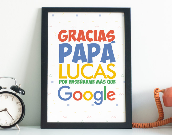 ¿Siempre que has tenido dudas sobre cualquier tema tu papá ha estado ahí para explicarte de todo? ¡Eso sí que es un buen padre! Por eso y mucho más, el mejor papá del mundo se merece una lámina personalizada como esta, que le diga que es el que más sabe de todo el planeta. ¿Tu papá es como Google? No existe regalo mejor que este para darle una sorpresa y hacerle reír. Dinos su nombre y aprovecha el Día del Padre para dejarlo boquiabierto. ¡Le encantará el regalo! Además, tienes la opción de elegir dos tamaños de lámina: A4 o 60x85 cm. Importante: El color del marco puede variar según stock.