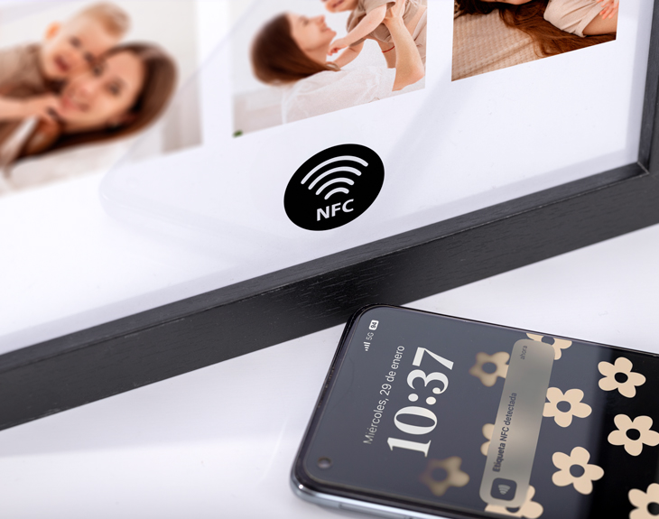 • Lámina NFC personalizada. • Marco de fotos. • Tarjeta recordatoria.