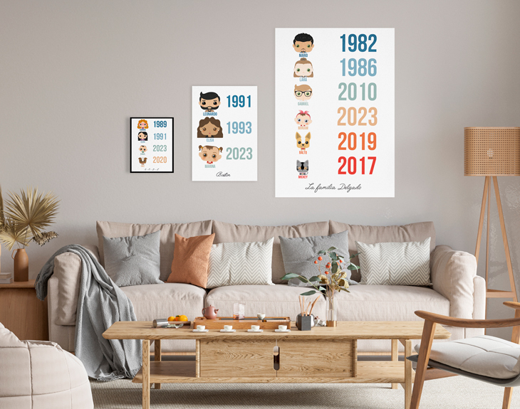 Tenemos un mensaje para todas esas familias que está súper unidas y les encanta tener un montón de recuerdos decorando su hogar. Esta lámina personalizada es el adorno perfecto para vosotros, porque es una forma de lo más original y diferente de decorar vuestro rincón favorito de casa. Su diseño es genial porque podrás añadir tus propios muñecos Tinok, junto a la fecha de nacimiento y nombre de cada miembro de la familia. ¿A que mola? Este original regalo es perfecto para sorprender a esa persona tan especial en fechas importantes como un cumpleaños, el Día de la Madre o del Padre, vuestro aniversario, el amigo invisible... Y lo mejor es que podrás elegir el tipo de lámina que más te guste: en formato digital, tamaño A4 con marco incluido, grande o gigante. ¡Hay para todos los gustos! Pero espera porque todavía tienes que personalizar esta lámina para que sea única. Añade el producto al carrito y entra en el área de personalización. Primero tendrás que elegir cuántos miembros de la familia quieres. Después, ya podrás crear tus muñecos Tinok con todos los detalles que quieras, colocarlos y añadir el texto para completar el diseño. Deja volar tu imaginación y tendrás el mejor regalo del mundo. Importante: Si escoges la opción "versión digital" te enviaremos el diseño por mail en alta resolución. De esta manera, tendrá la calidad necesaria para que puedas imprimirla en cualquier formato. En el formulario de entrega tendrás que seleccionar la opción "Recibir por Email para ahorrar los gastos de envío". Importante: El color del marco puede variar según stock.