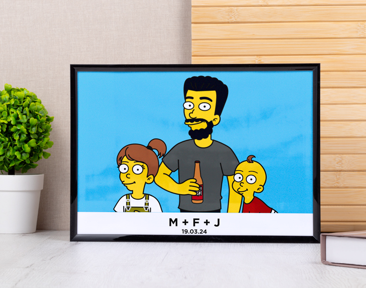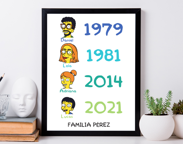 ¿Siempre has querido viajar la loca y caótica ciudad de Springfield? Este misterioso lugar (el cuál no se sabe en qué estado está) ha sido testigo de muchas aventuras increíbles y llenas de llantos y risas, gracias a sus fascinantes habitantes. Apu, Edna Krabappel, el señor Burns... ¡y obviamente la mejor familia de la televisión! Homer, Marge, Bart, Lisa y Maggie son los miembros de esa familia amarilla que nos han acompañado durante más de 30 años. Porque seamos claros... ¿quién no querría formar parte de esa alocada casa? Si conoces a alguien que siempre ha soñado con convertirse en un ciudadano más de Springfield, esta lámina personalizada con marco es el regalo perfecto. En esta lámina podrás añadir hasta 8 personajes, formando tu propia familia Simpson con vuestros personajes. ¿No sabes si encontrarás tu copia amarillo? Tranquilo, ¡tenemos más de 300 personajes! Con este regalo original, por fin tendrás tu yo más Simpson. ¡Cuelga esta lámina en la pared y todas las visitas te verán más animado que nunca! medi Importante: Se pueden escoger hasta un máximo de 6 personajes que aparecerán en la misma línea. Importante: El color del marco puede variar según stock. Importante: Si escoges la opción "versión digital" te enviaremos el diseño por mail en alta resolución. De esta manera, tendrá la calidad necesaria para que puedas imprimirla en cualquier formato. En el formulario de entrega tendrás que seleccionar la opción "Recibir por Email para ahorrar los gastos de envío".