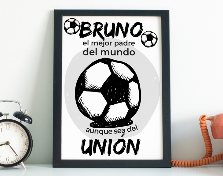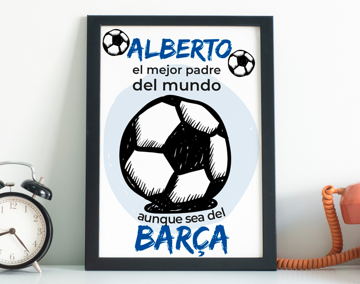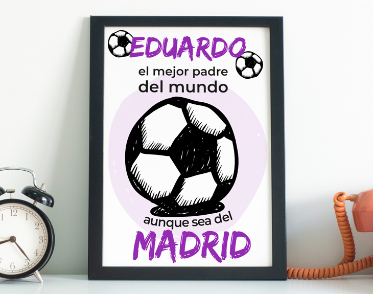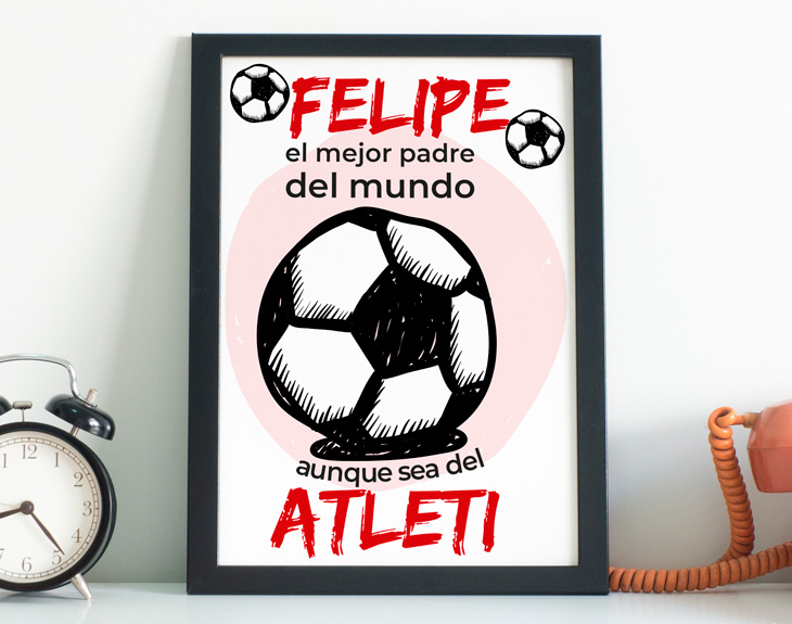 Nuestra lámina personalizada es perfecta para los padres e hijos que disfrutan los partidos de fútbol juntos. Si tu padre es de Atleti pero tú del Madrid, este diseño es perfecto para darle una sorpresa en el Día del Padre, su cumpleaños o un día cualquiera que quieras sorprenderlo. ¿Cuántas veces habéis discutido por fútbol? Muchísimas, ¿verdad? Este regalo original seguro que os hace reír mucho y disfrutar de un día inolvidable. No te olvides de elegir el color de lámina que quieras, de decirnos el nombre de tu padre y de mencionar su equipo. Además, tienes la opción de elegir dos tamaños de lámina: A4 o 60x85 cm. Importante: El color del marco puede variar según stock.