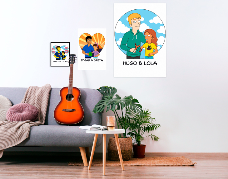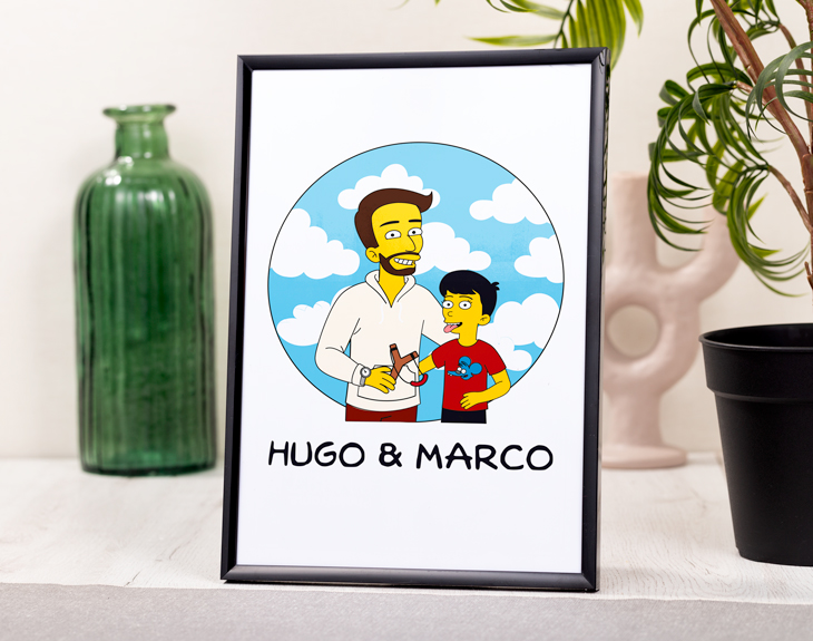 Nadie te enseña cómo ser padre pero cuando te ves en esa situación, sale a la luz ese instinto que hace que siempre quieres lo mejor para tus hijos y tu familia. Si tu padre también es un ejemplo a seguir y os cuida cada día, se merece el mejor regalo del mundo: ¡nuestra lámina personalizada! Sin duda lo más especial es su diseño, porque gracias a él os podréis convertir en auténticos personajes de Los Simpson. ¡Es lo más! Su cumpleaños, el Día del Padre o cualquier otra fecha especial son los momentos perfectos para dejarle sin palabras con este original regalo. Si os encanta ver juntos Los Simpson, seguro que os encanta tener vuestra lámina donde os veréis como dos personajes de Springfield. Quedará genial en cualquier rinconcito de casa: colgada en la pared, en una estantería o incluso en la mesa de la oficina de papá. Además, podrás elegir entre los diferentes tamaños que tenemos disponibles. ¡Le encantará! Al personalizar esta lámina lo único que tienes que hacer es seguir los pasos que te indicamos a continuación. Añade le producto al carrito y entra en el área de personalización. Ahí podrás crear tus propios personajes con todos los detalles necesarios para que sean igualitos que vosotros. Esta lámina convertirá vuestro hogar en un lugar único y muy diferente y todos vuestros invitados querrán una igual. ¡Es adorable! Importante: Si escoges la opción "versión digital" te enviaremos el diseño por mail en alta resolución. De esta manera, tendrá la calidad necesaria para que puedas imprimirla en cualquier formato. En el formulario de entrega tendrás que seleccionar la opción "Recibir por Email para ahorrar los gastos de envío". Importante: El color del marco puede variar según stock.