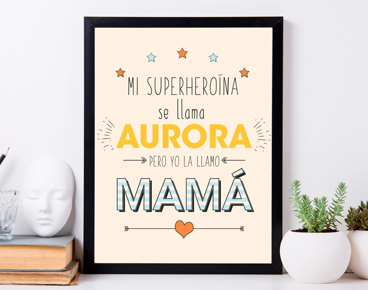 No hay detalle más bonito que el que tiene palabras bonitas. Eso es lo que pasa con esta lámina personalizada, que enamora a toda madre que lo recibe en casa. ¿Por qué será? A un madre le encanta que su hijo le diga que le quiere, pero que le grite que es su superheroína ya es subir de nivel. ¿No te parece? ¿Te atreves con uno de estos para tu mamá? Dinos su nombre y lo personalizaremos hasta hacerlo único para que pueda colgarlo o colocarlo en el mueble que más le guste. Es un regalo único y muy tierno para la mejor madre del mundo. Importante: El color del marco puede variar según stock. Podrás elegir esta lámina en dos tamaños: A4 o gigante, este último con unas medidas de 85 x 60 centímetros.