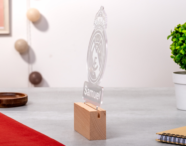 ¡Saca a relucir los colores de tu equipo favorito! Si el fútbol es algo muy personal e intenso para ti, seguro que hasta sueñas con ello. ¿Por qué no despertarte también con el Real Madrid o el Manchester United? Lleva esa pasión futbolística hasta tu cuarto con esta lámpara de metacrilato personalizada. ¡Con luces de colores para iluminar el escudo como más te guste! Pasa a formar parte de la alineación principal del Borussia Dortmund, el Inter de Milán o cualquier equipo del que te sientas uno más. Una vez añadas el producto, te haremos dos preguntas super rápida y sencillas. Así, con tan solo unos clics, tendrás tu diseño personalizado con el escudo de tu equipo de fútbol y tu nombre. Todo bien grabado sobre la pieza de metacrilato ajustada al tamaño del escudo e imborrable. Enchufa la lámpara a la corriente, a tu ordenador o cualquier ranura USB o cabezal, y prueba los distintos colores a combinar con tu escudo. De todas las ideas de regalo original para aficionados al fútbol, siempre lo mejor es aportar un toque personal como este lámpara personalizada. Puedes escoger entre las siguientes bases: -Base negra: sus medidas son de 8,3cm (diámetro) x 4,8cm (alto), y está hecha de plástico, cuenta con luces de colores. -Base de madera: sus medidas son de 14,5x6x3,5cm, y está hecha de madera. Cuenta con una sola luz, de color blanco ¡Importante! Por muy poco más, puedes seleccionar la opción de tener la base de madera grabada por un lado. Añade ese producto al carrito y podrás escribir un breve texto (nombres, fechas...) que irá grabado directamente sobre la madera para que dure eternamente. Importante: recomendamos no limpiar con líquidos, sólo con un paño en seco o ligeramente húmedo, y evitar los productos químicos. Importante: si escoges la base de madera esta sólo tiene luz blanca Importante: puede que el metacrilato llegue con un plástico protector.