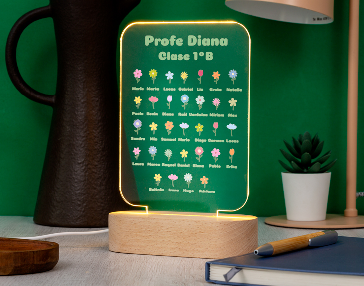 Nuestra lámpara de metacrilato personalizada "Jardín de la Clase" es un regalo original lleno de significado. Cada flor representa a un alumno o alumna, formando un jardín único que florece gracias a su profe. Puedes elegir entre varios diseños de flores y personalizarla con el nombre del profesor o profesora, convirtiéndola en un recuerdo inolvidable.