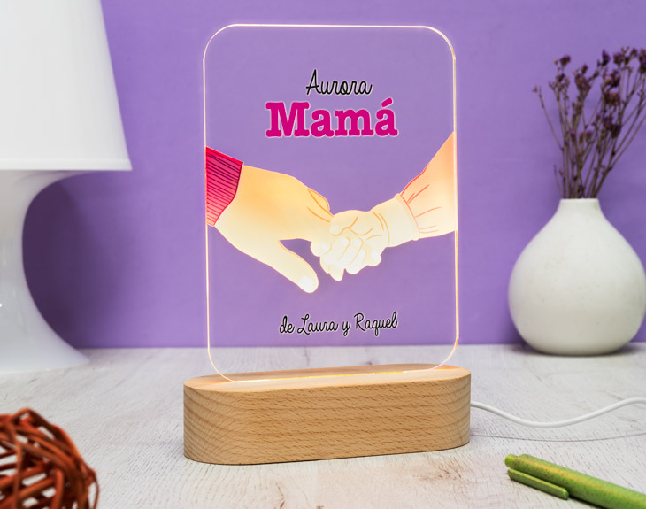 ¿Quién ha sido la persona que ha estado con nosotros en todos los momentos de nuestra vida? ¡Mamá ha estado ahí desde nuestro nacimiento! Su mano nos ha guiado a lo largo de todos estos años, por lo que se merece todo un homenaje. Esta lámpara de metacrilato personalizada está pensada para las mejores mamás. La base negra o de madera iluminará este diseño tan emocionante y cariñoso, plasmado en el metacrilato. Mamá se sentirá muy orgullosa de sus pequeños cuando vea esta lámpara de metacrilato con diseño para mamá. ¡Seguro que se queda con la boca abierta! El metacrilato, de 18,4 centímetros de alto y 13 centímetros de largo, tiene una forma vertical con esquinas redondeadas, lo que hará que la luz ocupe gran parte del objeto. La base puede ser tanto de color negro como de madera. La primera puede tener luces de colores, mientras que la segunda cuenta con una luz de color blanco. ¡Elige la base que más te guste! Este regalo original para madres está pensado para sorprender a la mejor mami del mundo en una ocasión especial, como un cumpleaños o en el Día de la Madre. ¿Qué mejor forma de emocionarla que con un diseño como este? Solo tendrás que añadirle los nombres al diseño, el cual encontrarás una vez añadas el producto al carrito, en el área de personalización. ¡Escribe clicando sobre los cuadros de texto! Funcionamiento: La lámpara funciona con un cable USB (incluido). La base negra cuenta con diferentes colores, que se pueden adaptar a tus gustos: si pulsas una vez te saldrá un color, si pulsas de nuevo, aparecerá otro, y así sucesivamente. También podrás elegir la opción intermitente: ¡todas las luces creando un festín de colores! Mientras tanto, la base de madera solo cuenta con una luz, que se apagará y se encenderá cada vez que aprietes el interruptor. Puedes escoger entre las siguientes bases: -Base negra: sus medidas son de 8,3x4,8cm, y está hecha de plástico. Cuenta con luces de colores -Base de madera: sus medidas son de 14,5x6x3,5cm, y está hecha de madera. Cuenta con una sola luz, de color blanco ¡Importante! Por muy poco más, puedes seleccionar la opción de tener la base de madera grabada por un lado. Añade ese producto al carrito y podrás escribir un breve texto (nombres, fechas...) que irá grabado directamente sobre la madera para que dure eternamente. Importante: recomendamos no limpiar con líquidos, sólo con un paño en seco o ligeramente húmedo, y evitar los productos químicos. Importante: puede que el metacrilato llegue con un plástico protector. Medidas del metacrilato 18,4 x 13 cm