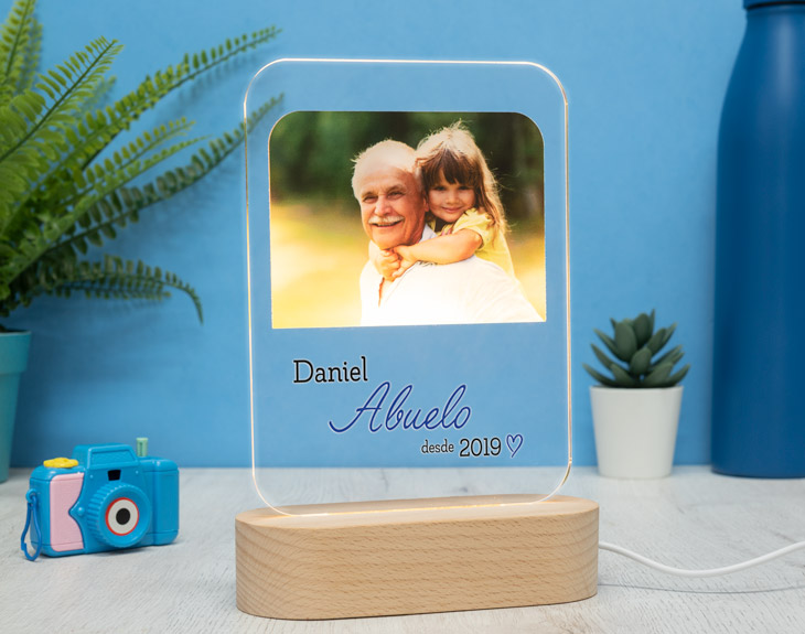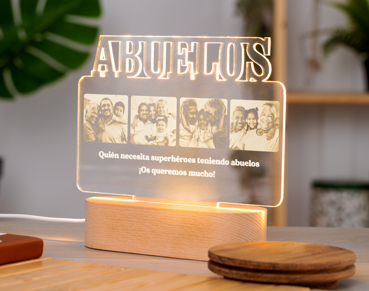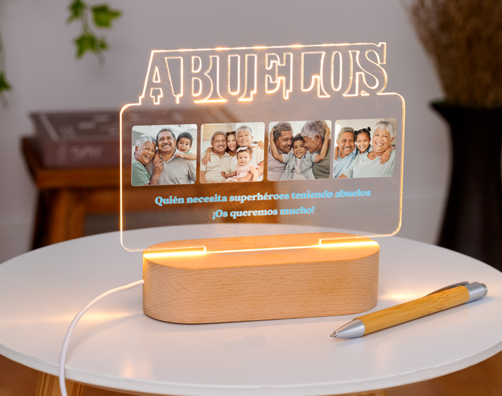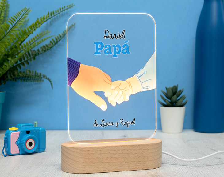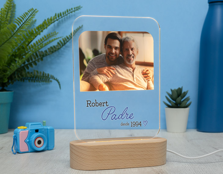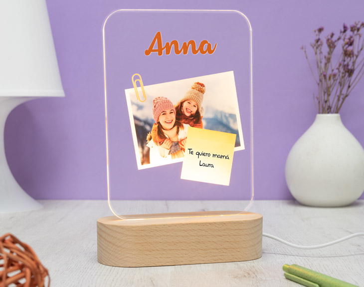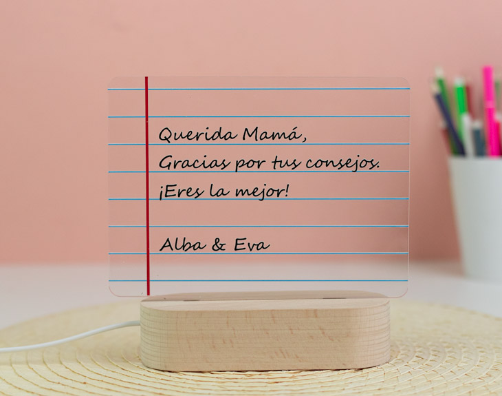 ¡No dejes de decirle a tu mamá que es la mejor del mundo! Ya sea cuando la llames por teléfono, cada vez que la veas en persona o, aunque no estés con ella, cada vez que se vaya a dormir. Hazlo de la manera más bonita y luminosa posible con esta lámpara de metacrilato personalizada. En lugar de escribir su nombre, seguro que también le encantará tener esta placa de metacrilato personalizada con el nombre de sus hijos, o de su marido. Escribe a esas personas tan especiales en su vida sobre este diseño con luz para que se ilumine tanto como ella ilumina vuestras vidas. ¡Así todo el mundo que entre a su salón o a su habitación podrá saber que es la mejor madre de todo el mundo! Nada mejor para decorar su casa y alegrarle el día a día que este regalo original para madres. Para que le sea totalmente fácil, tan solo tendrá que enchufar la base electrónica con el cable USB incluido a cualquier cabezal, ordenador, cargador portátil… y ya tendrá la luz constante. Funcionamiento: La lámpara funciona con un cable USB (incluido). La base negra cuenta con diferentes colores, que se pueden adaptar a tus gustos: si pulsas una vez te saldrá un color, si pulsas de nuevo, aparecerá otro, y así sucesivamente. También podrás elegir la opción intermitente: ¡todas las luces creando un festín de colores! Mientras tanto, la base de madera solo cuenta con una luz, que se apagará y se encenderá cada vez que aprietes el interruptor. Puedes escoger entre las siguientes bases: -Base negra: sus medidas son de 8,3cm (diámetro) x 4,8cm (alto), y está hecha de plástico. Cuenta con luces de colores. -Base de madera: sus medidas son de 14,5x6x3,5cm, y está hecha de madera. Cuenta con una sola luz, de color blanco. Medidas aproximadas: 13 cm x 17 cm (metacrilato). Importante: recomendamos no limpiar con líquidos, sólo con un paño en seco o ligeramente húmedo, y evitar los productos químicos. Importante: puede que el metacrilato llegue con un plástico protector.