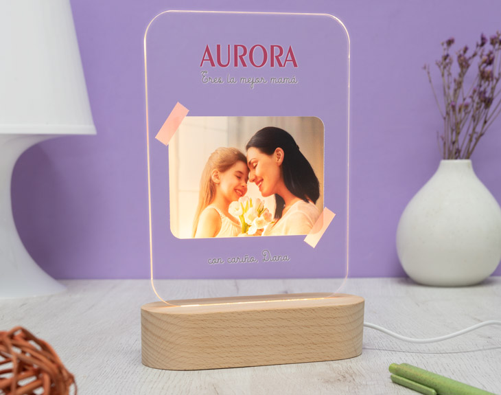 ¿Qué sería del mundo sin las madres? Seguro que sería muy diferente para todos nosotros, porque la figura de una madre es única e irremplazable. Las madres siempre están ahí para ayudarnos, vernos crecer y acompañarnos en nuestro camino porque tenerlas no tiene precio. Y como está claro que son las mejores del mundo, se merecen un regalo muy especial como esta lámpara de metacrilato personalizada hecha para decirle a todas las madres que son las mejores. Es genial para regalar en esas fechas señaladas donde la protagonista es tu madre porque seguro que le hace muchísima ilusión recibir una lámpara tan única como esta. ¡Se quedará sin palabras! El Día de la Madre, su cumpleaños o cualquier día especial es perfecto para que reciba esta original lámpara de metacrilato con diseño para mamá que quedará perfecta en su mesita de noche. Podrá verla todos los días y acordarse siempre de ti. ¡Es un regalo único! Lo mejor de esta preciosa lámpara es que está formada por una placa de metacrilato, en la que va impreso el diseño y que tiene unas medidas de 18,4 centímetros de alto y 13 centímetros de ancho y su base, que puede ser de madera o de plástico. La base de madera solo da luz blanca y la base negra de plástico cuenta con luces de varios colores. ¡Tú decides cuál te gusta más! Si ya estás pensando cómo personalizar tu lámpara de metacrilato, no te preocupes porque es muy sencillo. Primero escoge la opción de lámpara que más te guste, después dentro del diseño, añade el nombre de tu madre y escribe eso que le quieras decir y quieres que quede impreso en el metacrilato. ¡Es un regalo muy especial! Podrás elegir también grabar un mensaje en la base de madera por muy poquito más. Nosotros nos ocupamos del resto para que quede perfecto. Funcionamiento: La lámpara funciona con un cable USB (incluido). La base negra cuenta con diferentes colores, que se pueden adaptar a tus gustos: si pulsas una vez te saldrá un color, si pulsas de nuevo, aparecerá otro, y así sucesivamente. También podrás elegir la opción intermitente: ¡todas las luces creando un festín de colores! Mientras tanto, la base de madera solo cuenta con una luz, que se apagará y se encenderá cada vez que aprietes el interruptor. Puedes escoger entre las siguientes bases: -Base negra: sus medidas son de 8,3 x 4,8 cm, y está hecha de plástico. Cuenta con luces de colores -Base de madera: sus medidas son de 14,5 x 6 x 3,5 cm, y está hecha de madera. Cuenta con una sola luz, de color blanco ¡Importante! Por muy poco más, puedes seleccionar la opción de tener la base de madera grabada por un lado. Añade ese producto al carrito y podrás escribir un breve texto (nombres, fechas...) que irá grabado directamente sobre la madera para que dure eternamente. Importante: recomendamos no limpiar con líquidos, sólo con un paño en seco o ligeramente húmedo, y evitar los productos químicos. Importante: puede que el metacrilato llegue con un plástico protector. Medidas del metacrilato: 18,4 x 13 cm.