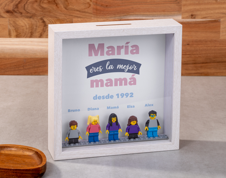 ¿Te imaginas despertar cada día y ver en la mesita de noche vuestras fotos favoritas? ¡No hay mejor manera de empezar la jornada! Ahora podrás darle este gustazo a tu madre con nuestra lámpara de metacrilato personalizada. Únicamente tienes que escoger ocho fotos, esas que consiguen trasladaros a vuestros mejores recuerdos, e insertarlas en el diseño. En todo momento podréis ver una previsualización y hacer los cambios que hagan falta, ajustar el tamaño de la foto, cambiar la distribución o sustituirla por otra que te convenza más. El diseño está disponible en varios colores diferentes, ¡podrás escoger el preferido de mamá! Además, tenemos dos tipos de base, una de madera más elegante y minimalista con luz blanca y una negra de plástico que tiene opción de luces multicolor, ¡super divertida! Si todavía no has encontrado el regalo perfecto para mamá aquí tienes la solución. Un detalle único, muy especial y perfecto para decorar cualquier rincón de la casa, en resumen, ¡un acierto asegurado! Funcionamiento: La lámpara funciona con un cable USB (incluido). La base negra cuenta con diferentes colores, que se pueden adaptar a tus gustos: si pulsas una vez te saldrá un color, si pulsas de nuevo, aparecerá otro, y así sucesivamente. También podrás elegir la opción intermitente: ¡todas las luces creando un festín de colores! Mientras tanto, la base de madera solo cuenta con una luz, que se apagará y se encenderá cada vez que aprietes el interruptor. Puedes escoger entre las siguientes bases: -Base negra: sus medidas son de 8,3x4,8cm, y está hecha de plástico. Cuenta con luces de colores -Base de madera: sus medidas son de 14,5x6x3,5cm, y está hecha de madera. Cuenta con una sola luz, de color blanco. ¡Importante! Por muy poco más, puedes seleccionar la opción de tener la base de madera grabada por un lado. Añade ese producto al carrito y podrás escribir un breve texto (nombres, fechas...) que irá grabado directamente sobre la madera para que dure eternamente. Importante: recomendamos no limpiar con líquidos, sólo con un paño en seco o ligeramente húmedo, y evitar los productos químicos. Importante: puede que el metacrilato llegue con un plástico protector. Medidas del metacrilato: 17,5 x 12 cm.